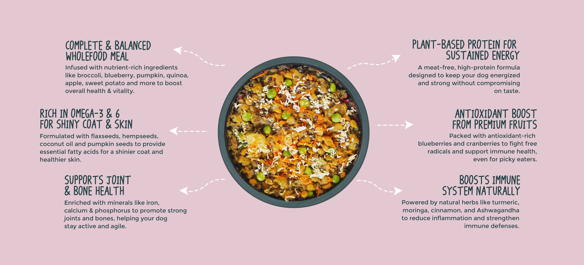 Yes, studies show that when formulated correctly, dogs can live healthily on vegan dog food. Dogs are classified as omnivores, meaning their physiology allows them to digest both animal and plant‐based foods. Studies show that over thousands of years, domestic dogs evolved multiple digestive enzymes and metabolic adaptations that help them process starches, grains, and plant proteins, not just meat. FurrMate’s meals are created by vets and nutritionists to ensure complete, balanced nutrition for digestion, immunity, energy, and shiny coats—making us one of the best veg dog food brands in India.