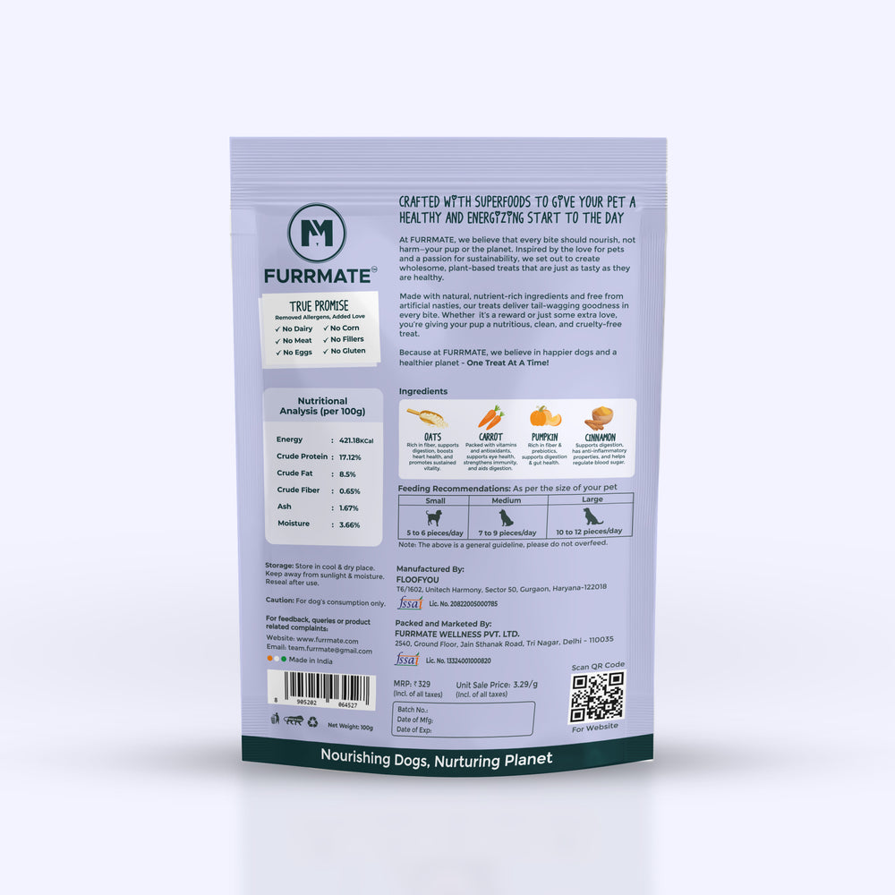 The Treats Duo includes our two bestselling vegan dog treats in India: Carrot & Pumpkin (crunchy and fibrous) and Peanut Butter & Banana (crunchy and naturally sweet). Both are made with natural ingredients such as oats, peanut butter, carrot, pumpkin, banana, and cinnamon.